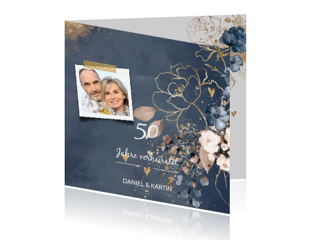 Blaue Karte Zur Goldene Hochzeit Mit Verzierten Blumen Und Foto